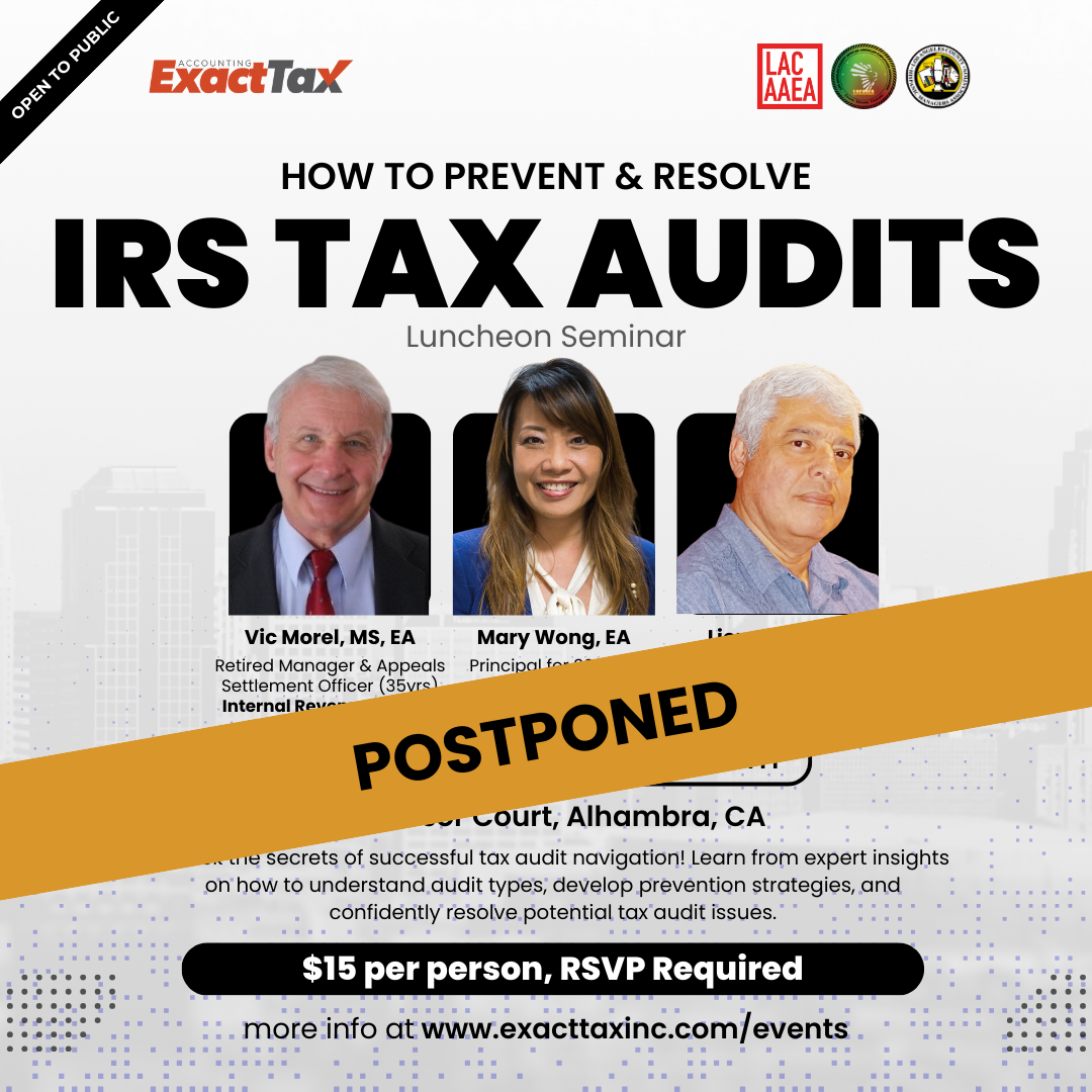 🚨 Important Update: Due to the devastating fires affecting our California communities, we’re postponing indefinitely this Saturday’s IRS Tax Audits luncheon seminar.